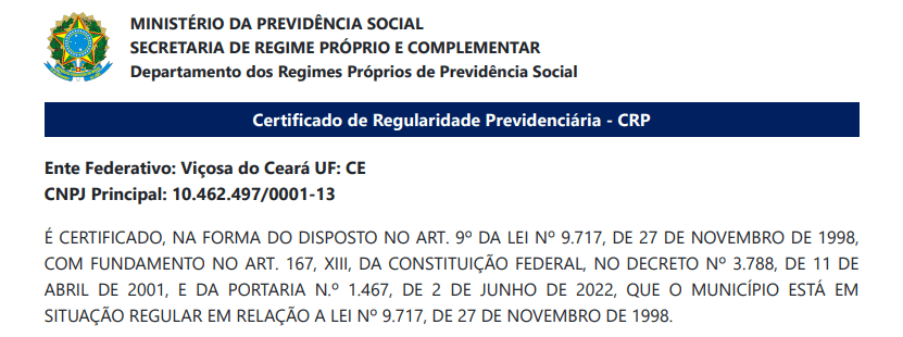 O Município de Viçosa do Ceará, por meio do Regime Próprio de Previdência Social, VIÇOSA-PREV, acaba de renovar seu Certificado de Regularidade Previdenciária-CRP, junto ao Ministério da Previdência Social. O novo Certificado foi emitido administrativamente no último dia 24.04.2025, após a comprovação da regularidade da gestão previdenciária em relação a todos os critérios de regularidade exigidos para a renovação do documento. A validade do novo CRP é de 180 dias. O Certificado de Regularidade Previdenciária – CRP é um documento fornecido pela Secretaria de Regime Próprio e Complementar, do Ministério da Previdência Social, que atesta o cumprimento dos critérios e exigências estabelecidos na Lei nº 9.717, de 27 de novembro de 1998, pelo regime próprio de previdência social de um Estado, do Distrito Federal ou de um Município, ou seja, atesta que o ente federativo, neste caso, o município, segue normas de boa gestão, de forma a assegurar o pagamento dos benefícios previdenciários aos seus segurados no futuro. Link para acesso ao certificado: